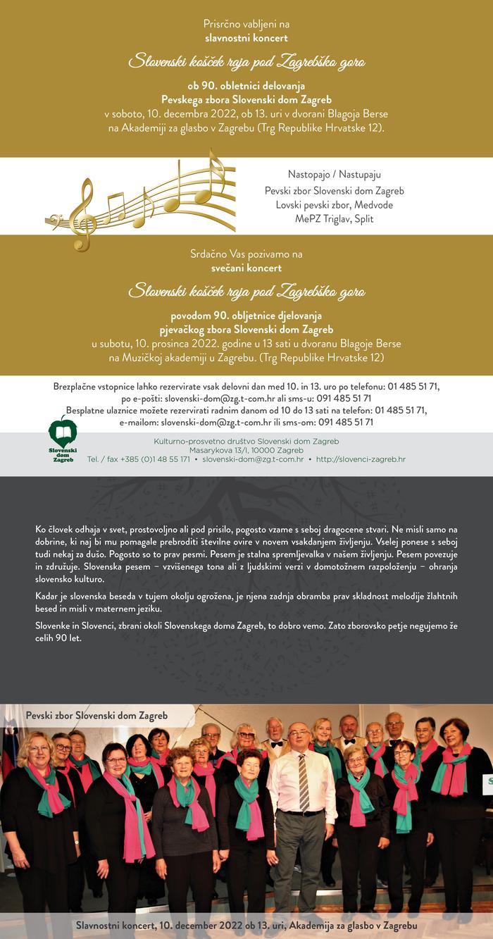 Srdačno Vas pozivamo na svečani koncert Slovenski košček raja pod Zagrebško goro povodom 90. obljetnice djelovanja pjevačkog zbora Slovenski dom Zagreb, na Muzičkoj akademiji u Zagrebu.