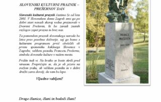 Slovenski kulturni praznik – Prešernov dan, ove je godine prvi put obilježen uz spomenik Franca Prešerna, koji je prošle godine otkriven na zagrebačkom jezeru Bundek. Kulturnim programom posvećenom poeziji najvećega slovenskog pjesnika, mladi slovenski pjevač Matic Zakonjšek i gitarist Ivan Šimatović uveličali su svečanost koju su priredili Slovenski dom Zagreb i Veleposlanstvo Republike Slovenije. Tom [...]
