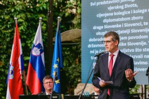 Dan ranije, 20. lipnja, slovensko veleposlanstvo u Hrvatskoj organiziralo je prijem u vrtu Arheološkog muzeja. Nazočili su mu važni predstavnici iz političkog, gospodarskog, kulturnog i društvenog života u Hrvatskoj, predstavnici drugih diplomatskih misija u Hrvatskoj, pripadnici slovenske zajednice te brojni Slovenci koji žive ili rade u Hrvatskoj. Veleposlanik Gašper Dovžan u svom se govoru prisjetio događaja prije 33 godine, kad su Slovenija i Hrvatska koordinirano proglasile svoju državnost, te svih onih koji su branili našu suverenost. Prijem je nastavljen uz tradicionalna slovenska jela i glazbenu pratnju kvinteta Orkestra Slovenske vojske. (tbb, akm)