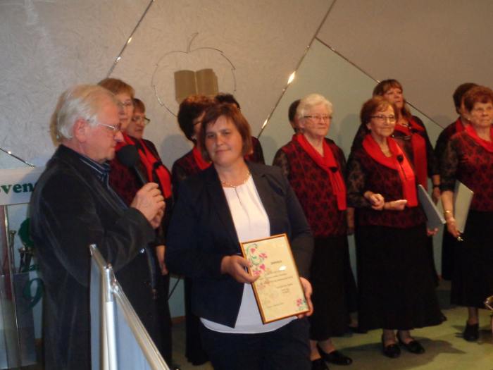 - Predsjednik Slovenskoga doma i VSNM GZ, Darko Šonc predaje zahvalnicu zamjenici gradonačelnika Metlike, Martini Legan-Janžekovič, za belokranjsku narodnu nošnju koju je Slovenskom domu darovala Općina Metlika.