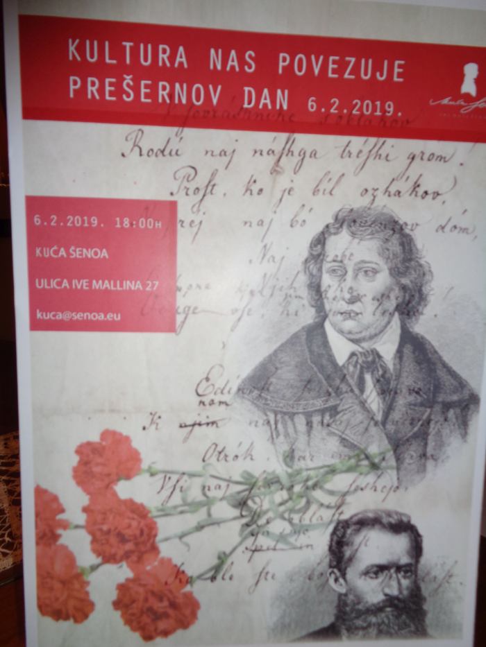 Zagreb – Uoči slovenskoga kulturnog praznika – Prešernova dana, u Kući Šenoa održan je večernji razgovor o Francu Prešernu pod naslovom Karanfil s Prešernovoga groba. Razgovor o najvećem slovenskom pjesniku vodili su dr. Marijan Dović, književni povjesničar, viši znanstveni suradnik i izvanredni profesor na Institutu za slovensku literaturu i literarne znanosti ZRC SAZU i dr. Zvonko Kovač, redoviti profesor na Filozofskom fakultetu u Zagrebu, s Katedre za slovenski jezik i književnost.