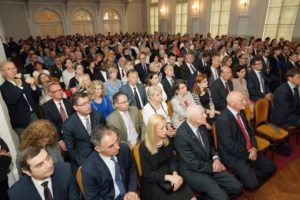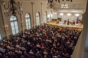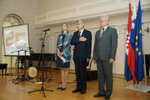 Zagreb – 14. lipnja 2016. Veleposlanstvo Republike Slovenije je u povodu 25. obljetnice državnosti Republike Slovenije, u suradnji sa Slovenskim domom i Vijećem slovenske nacionalne manjine Grada Zagreba, u Hrvatskom glazbenom zavodu priredilo svečani koncert i prijem. Goste su pozdravili veleposlanica dr. Smiljana Knez, predsjednik Saveza slovenskih društava u Hrvatskoj Darko Šonc i počasni gost, predsjednik Hrvatskoga sabora, akademik Željko Reiner.