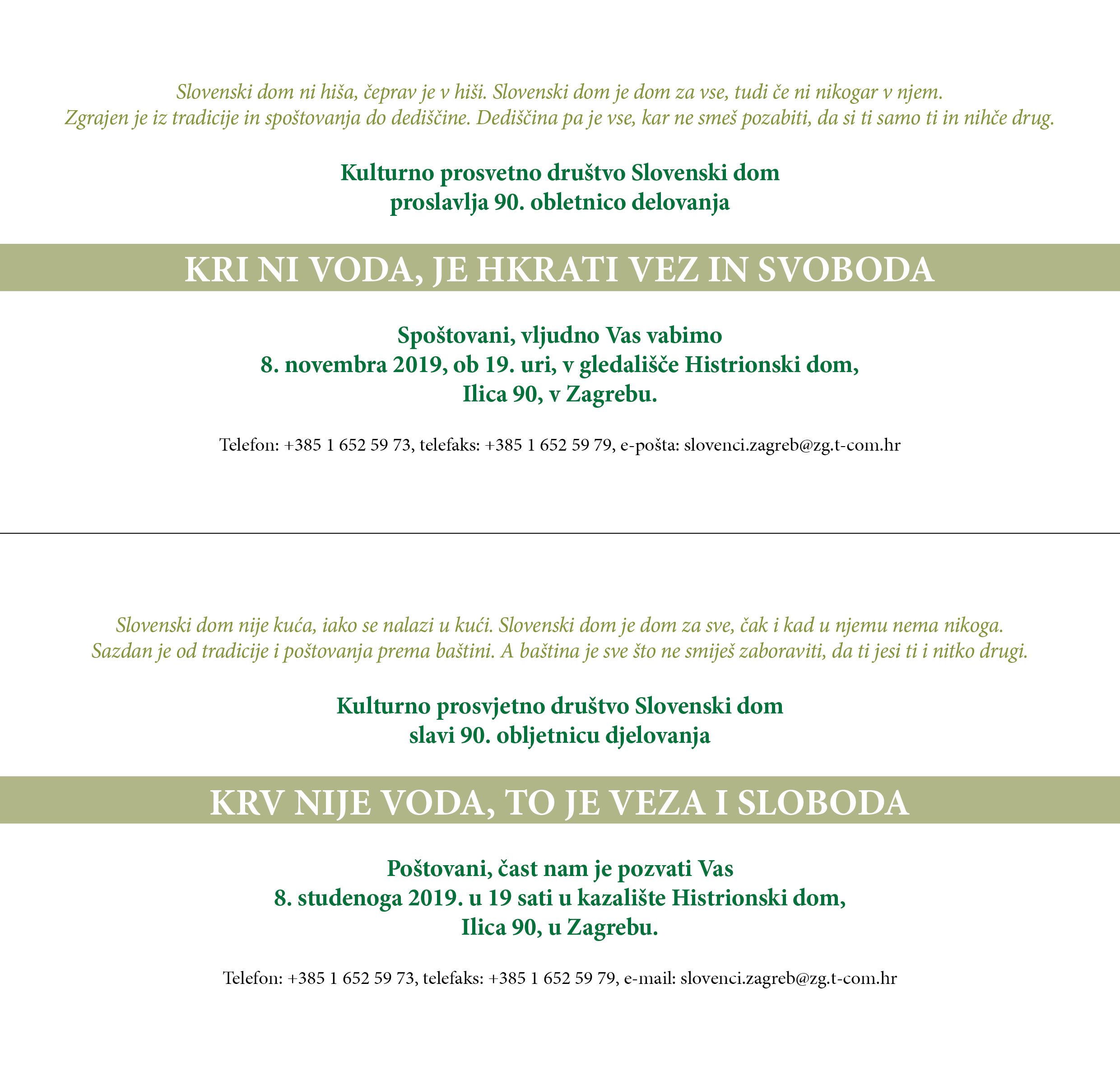 8.11.2019 ob 19. uri: svečanost ob 90-letnici Slovenskega doma. Histrionski dom, Zagreb