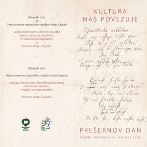 Vabilo – slovenski kulturni praznik, Prešernov dan Ob slovenskem kulturnem prazniku Vas vljudno vabimo na prireditve v Hrvaško narodno gledališče in Slovenski dom v Zagrebu. Program: agata2018-01-26T10:14:45+01:0024. januarja 2018| Delite to zgodbo, izberite svojo platformo! FacebookTwitterLinkedInEmail