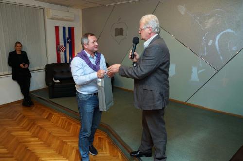 Predsednik Slovenskega doma Darko Šonc podarja Matjažu Keku knjigo Slovenci v hrvaškem športu. Foto: Anton Bukovec