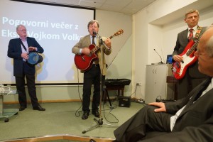 Zagreb – 29. april 2015 Dolgoletni slovenski diplomat, aktiven publicist za področje zunanje in notranje politike in aktualni veleposlanik Republike Slovenije v Zagrebu Vojko Volk je v pogovoru s Tanjo Borčić Bernard spregovoril o svojih preteklih petih letih na Hrvaškem, o izkušnjah, občutkih in spominih, ki jih bo odnesel nazaj v domovino. Veleposlanik Volk je predstavil tudi svoj knjižni prvenec Od naroda do države in nazaj, v katerem razmišlja o razpadu Jugoslavije, pravici do samoodločbe, Sloveniji in njeni samostojnosti, človekovih pravicah in o Kosovu. Pogovorni večer je s svojim nastopom obogatil Trio Implatanti. (akm)