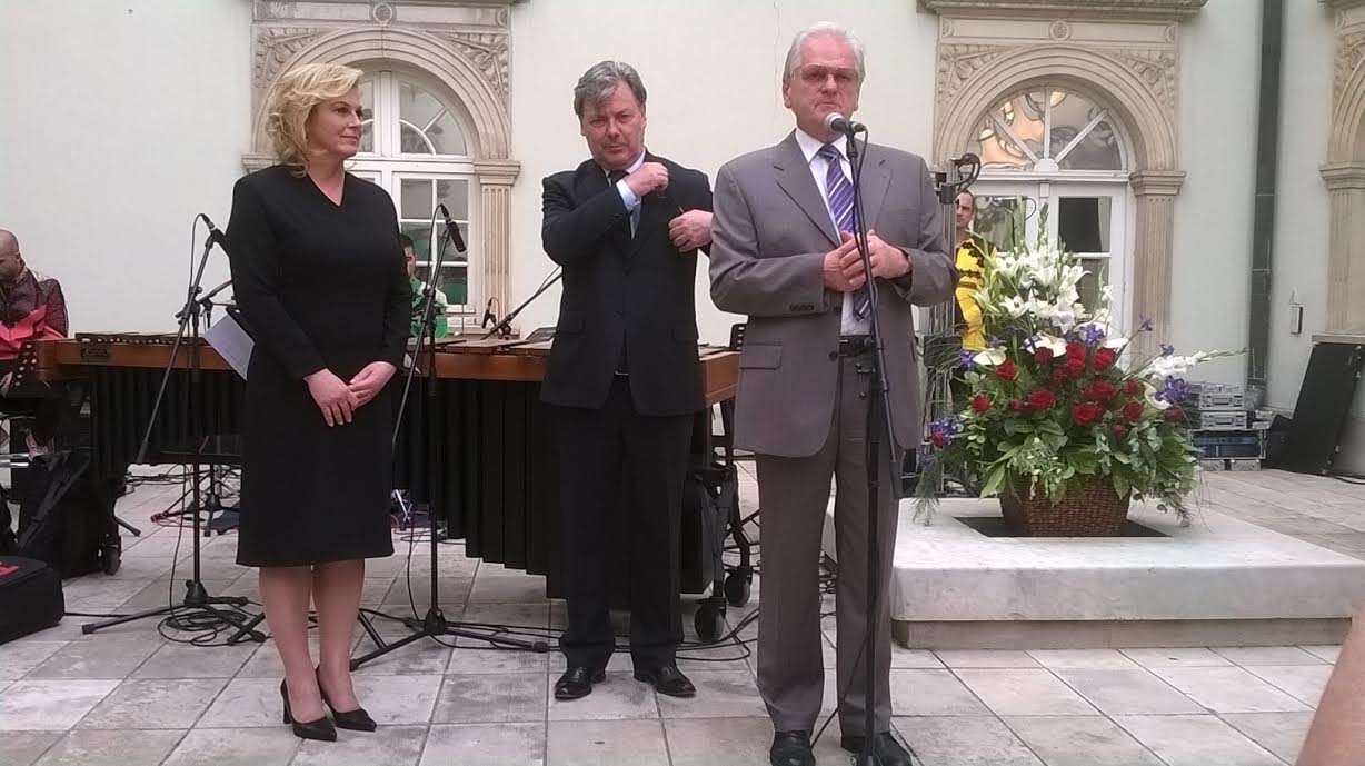 Zagreb – 16. junij 2015   Sprejema, ki ga je v Klovićevih dvorih pripravilo veleposlaništvo Republike Slovenije na Hrvaškem, se je udeležila tudi hrvaška predsednica Kolinda Grabar-Kitarović, ki je po nagovorih veleposlanika nj. eksc. Vojka Volka in predsednika Slovenskega doma Darka Šonca med drugim izpostavila „… da prijateljstvo med državama in narodoma presega odprta politična vprašanja.“