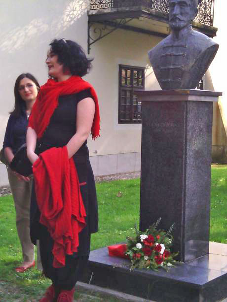 Maja Gal Štromar ob spomeniku Stanka Vraza pred Samoborskim muzejem. Foto: a.k.m.