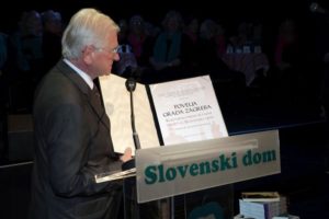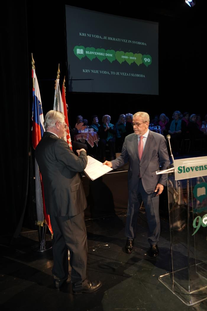 - Predsednik Slovenskega doma Darko Šonc prejema iz rok župana Milana Bandića priznanje Mesta Zagreba.