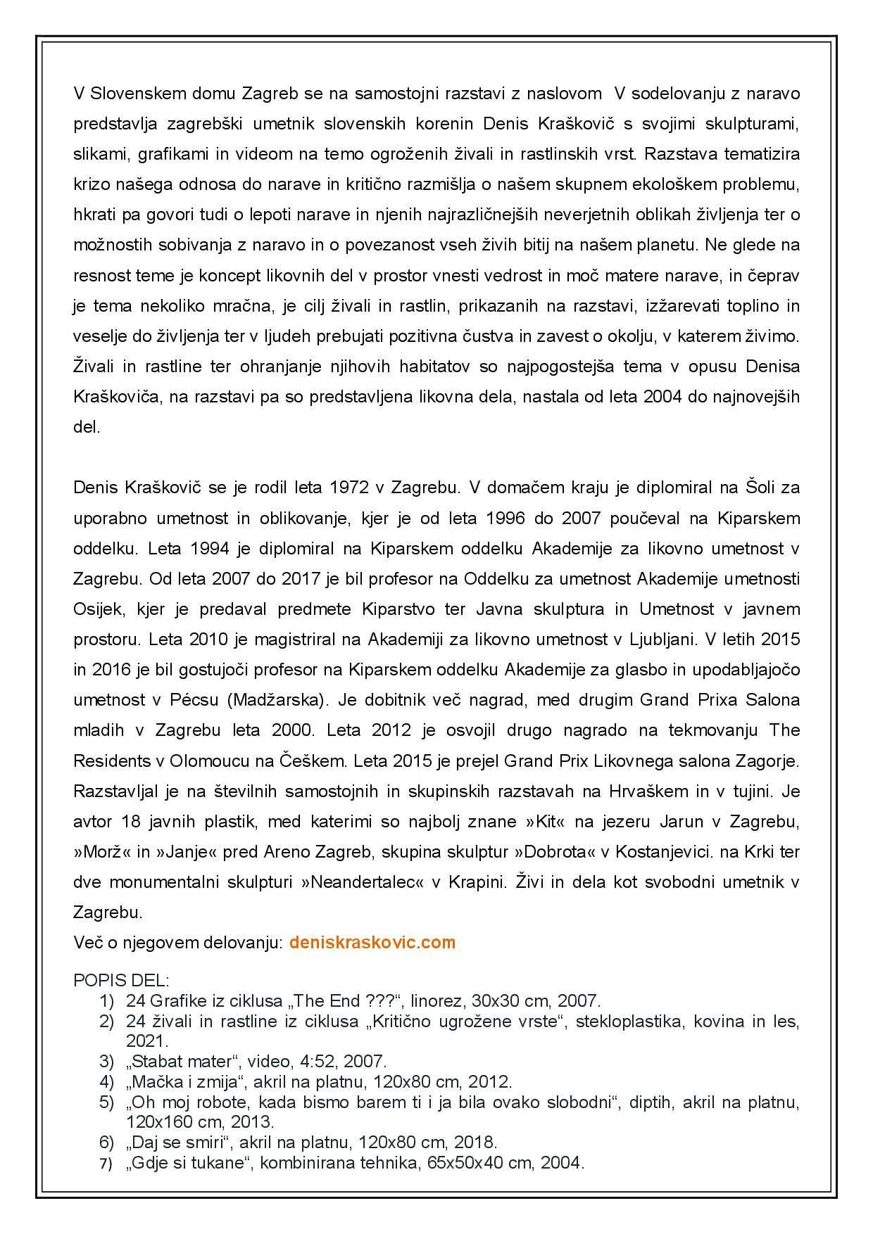 Denis Kraškovič, zagrebški likovni umetnik slovenskih korenin in član Slovenskega doma Zagreb, se je danes predstavil s samostojno razstavo V sodelovanju z naravo / U suradnji s prirodom, na kateri so predstavljene skulpture, slike in grafike na temo ogroženih živalskih in rastlinskih vrst.