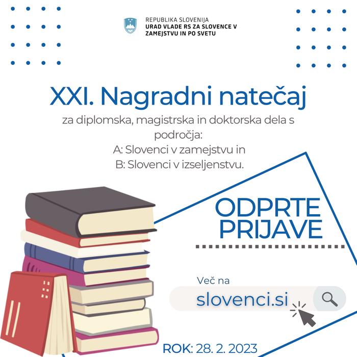 Več o nagradnem natečaju: https://www.gov.si/zbirke/javne-objave/xxi-nagradni-natecaj-za-diplomske-magistrske-in-doktorske-naloge-s-podrocja-slovencev-v-zamejstvu-in-slovencev-po-svetu/