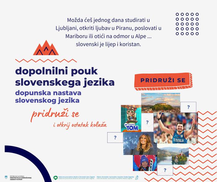 Slovenski dom Zagreb i Vijeće slovenske nacionalne manjine Grada Zagreba, uz potporu Ministarstva prosvjete i sporta Republike Slovenije, organiziraju dopunsku nastavu slovenskoga jezika i kulture za djecu i mlade od 8 do 11 i od 12 do 17 godina.