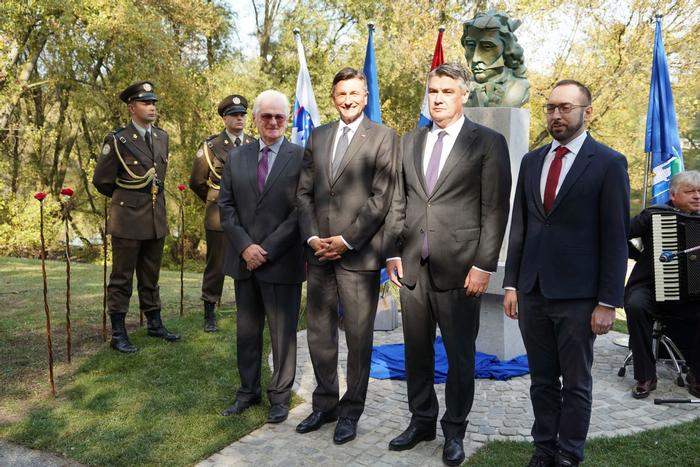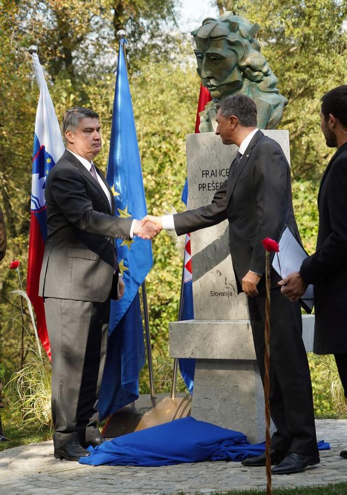 Po kulturnem programu, v katerem so nastopili Zlatko Ožbolt, Tadej Pišek, Marjan Krajna, Matic Zakonjšek in Ivana Miletić, sta predsednik Republike Hrvaške Zoran Milanović in predsednik Republike Slovenije Borut Pahor odkrila spomenik Francetu Prešernu. (akm)